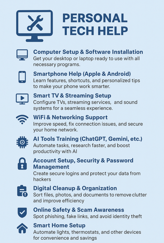 | π» Personal Tech Help β’ Computer Setup & Software Installation β Get your desktop or laptop ready to use with all necessary programs. β’ Smartphone Help (Apple & Android) β Learn features, shortcuts, and personalized tips to make your phone work smarter. β’ Smart TV & Streaming Setup β Configure TVs, streaming services, and sound systems for a seamless experience. β’ WiFi & Networking Support β Improve speed, fix connection issues, and secure your home network. β’ AI Tools Training (ChatGPT, Gemini, etc.) β Automate tasks, research faster, and boost productivity with AI. β’ Account Setup, Security & Password Management β Create secure logins and protect your data from hackers. β’ Digital Cleanup & Organization β Sort files, photos, and documents to remove clutter and improve efficiency. β’ Online Safety & Scam Awareness β Spot phishing, fake links, and avoid identity theft. β’ Smart Home Setup β Automate lights, thermostats, and other devices for convenience and savings. β’ App Recommendations & Training β Learn the best apps for health tracking, budgeting, and communication. β’ Creative Tech Projects β Explore AI-powered photo editing, video creation, and digital art. β’ Cloud Storage Setup β Organize and back up files with Google Drive, iCloud, Dropbox, or other cloud services. | π Small Business Services β’ Website Design & Setup β Build a professional, mobile-friendly site that reflects your brand. β’ Website Redesign & Updates β Refresh your existing site for better performance and usability. β’ SEO (Search Engine Optimization) β Use targeted keywords to help your site rank higher on Google. β’ Local SEO & Google Business Profile Optimization β Improve local search visibility so customers can find you nearby. β’ Content Updates & Management β Keep your site fresh with updated text, images, and pages. β’ Basic Tech Support for Businesses β Troubleshoot website errors, broken links, or slow performance. β’ Domain & Hosting Assistance β Set up, transfer, or configure your domain and hosting settings. β’ Digital Marketing Guidance β Social media, email marketing, and online ad strategies to attract more leads. |